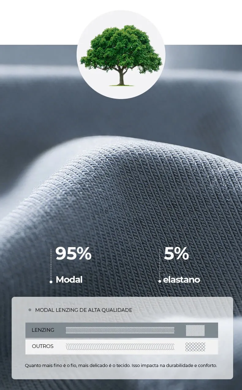 Outra excelente vantagem do Modal é a sua maior resistência ao encolhimento e às bolinhas indesejáveis no tecido (peeling), apresentando uma vida útil muito maior do que a de outros tipos de cuecas.