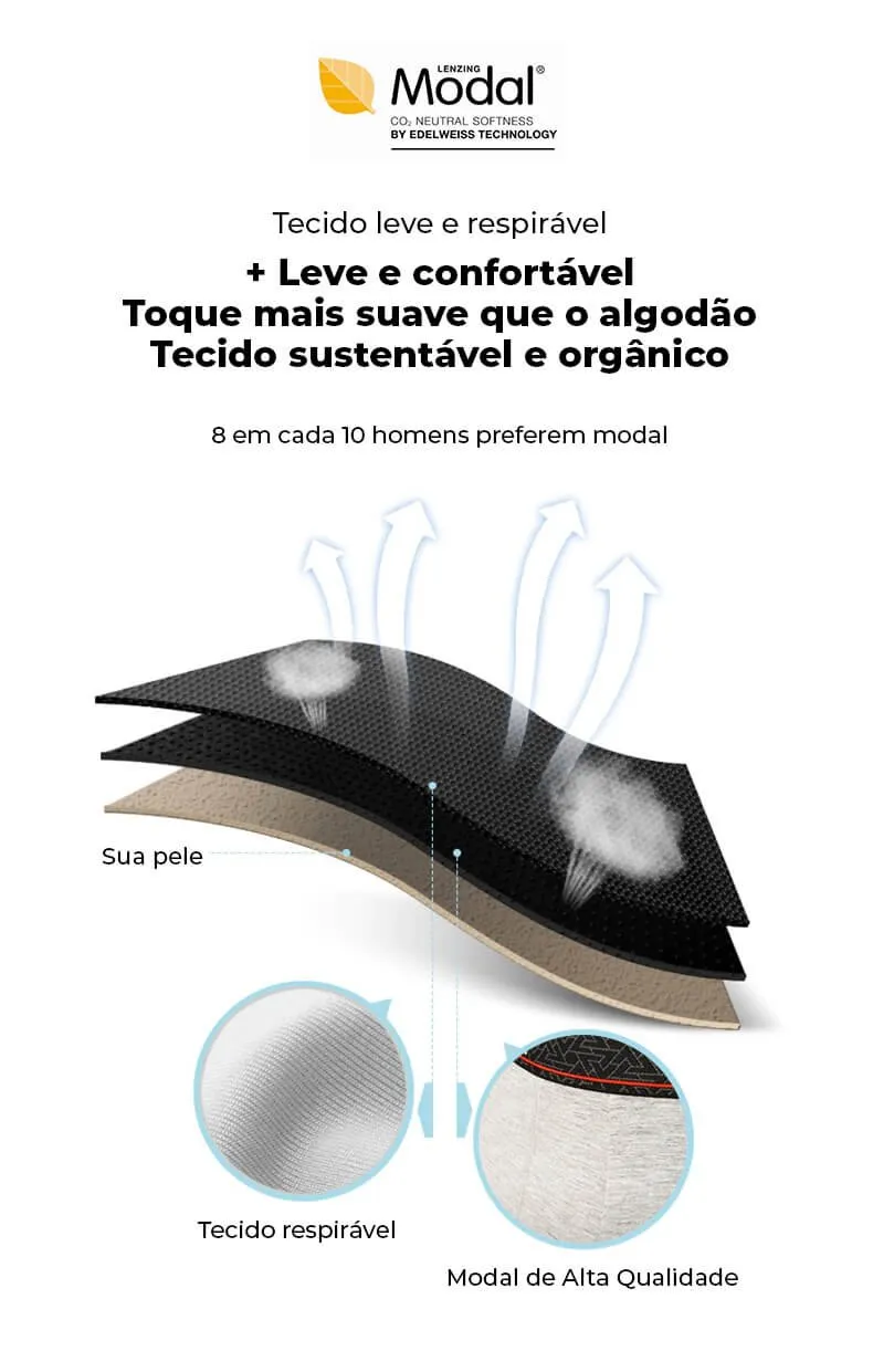 Por ser confeccionado com tecnologia moderna, o Modal resulta em cuecas leves e confortáveis, atuando quase como uma segunda pele.